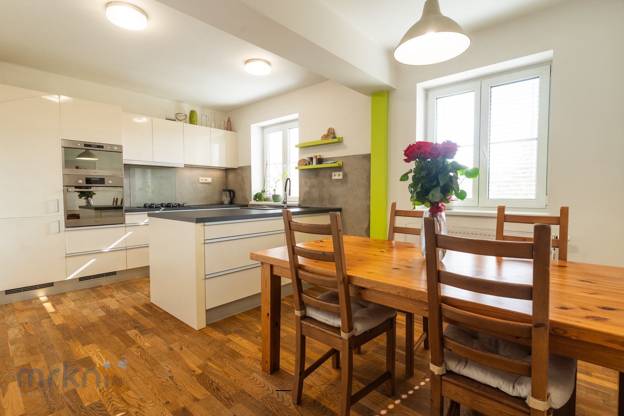 Dispozici tvoří obývací pokoj, ložnice a dětský pokoj s vestavěným nábytkem, připravený pro dvě děti. Prostorná kuchyně s ostrůvkem a jídelním stolem je ideálním centrem rodinného života. Koupelna je vybavena vanou i sprchovým koutem s kaleným sklem a podlahovým vytápěním, takže nabízí pohodlí i praktičnost.