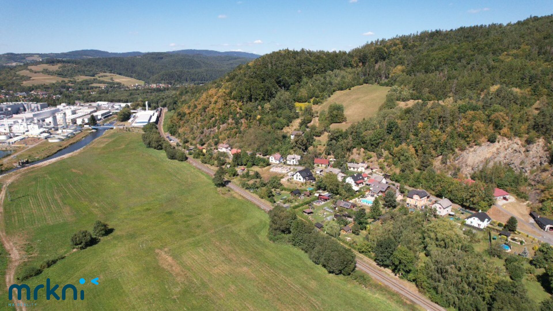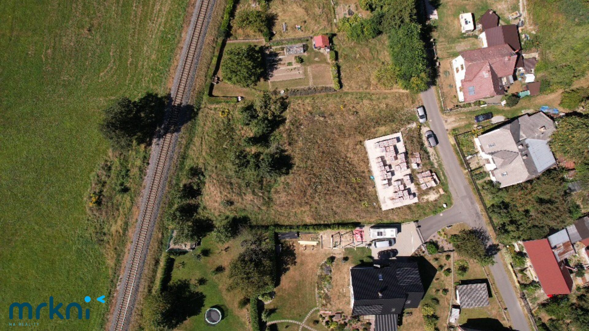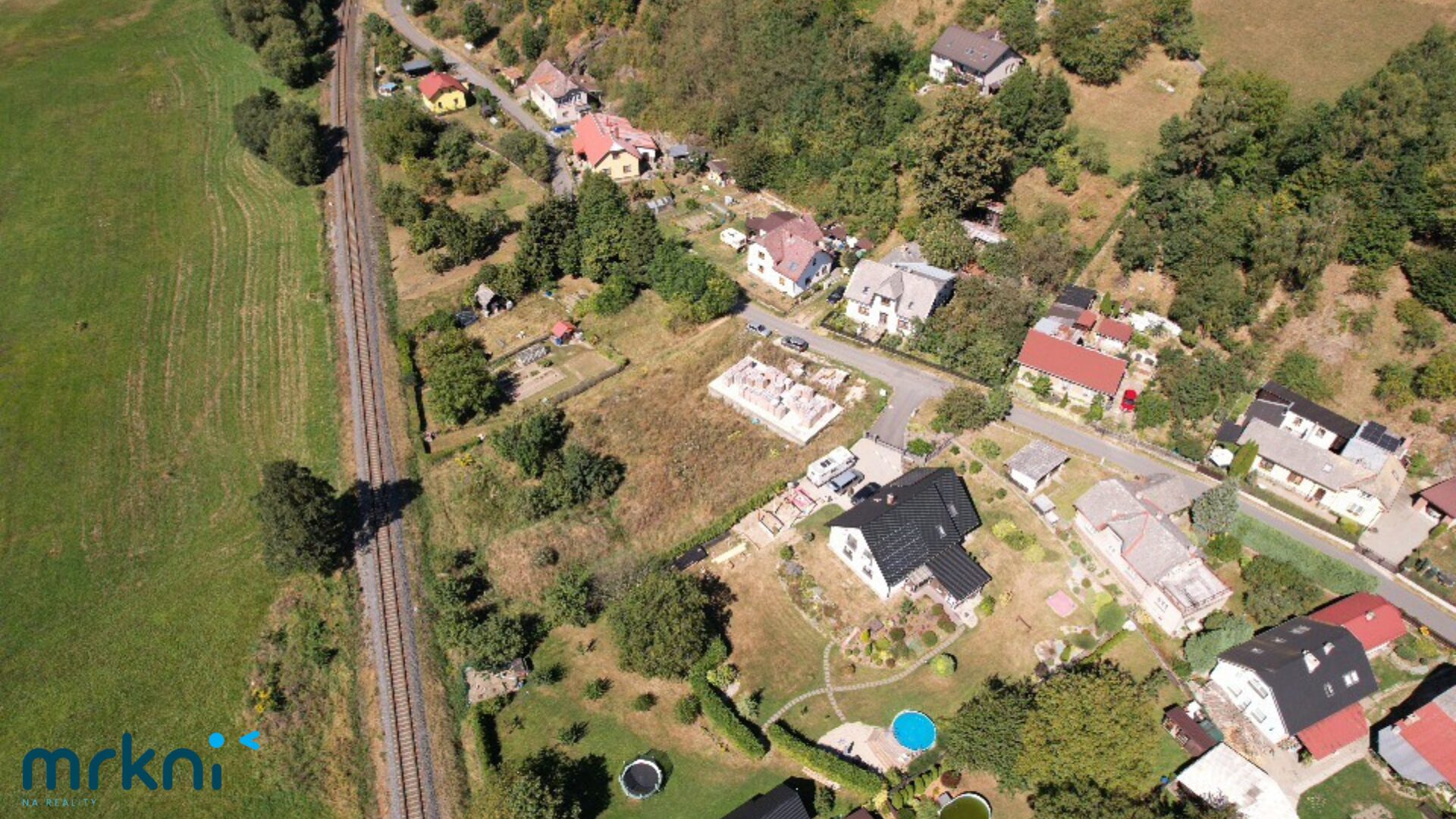 Za pozemkem vede železniční trať, což pro někoho může znít jako nevýhoda, ale má to i svou významnou výhodu – z této strany vám nikdy nevyroste žádná zástavba a budete mít trvalý volný výhled.