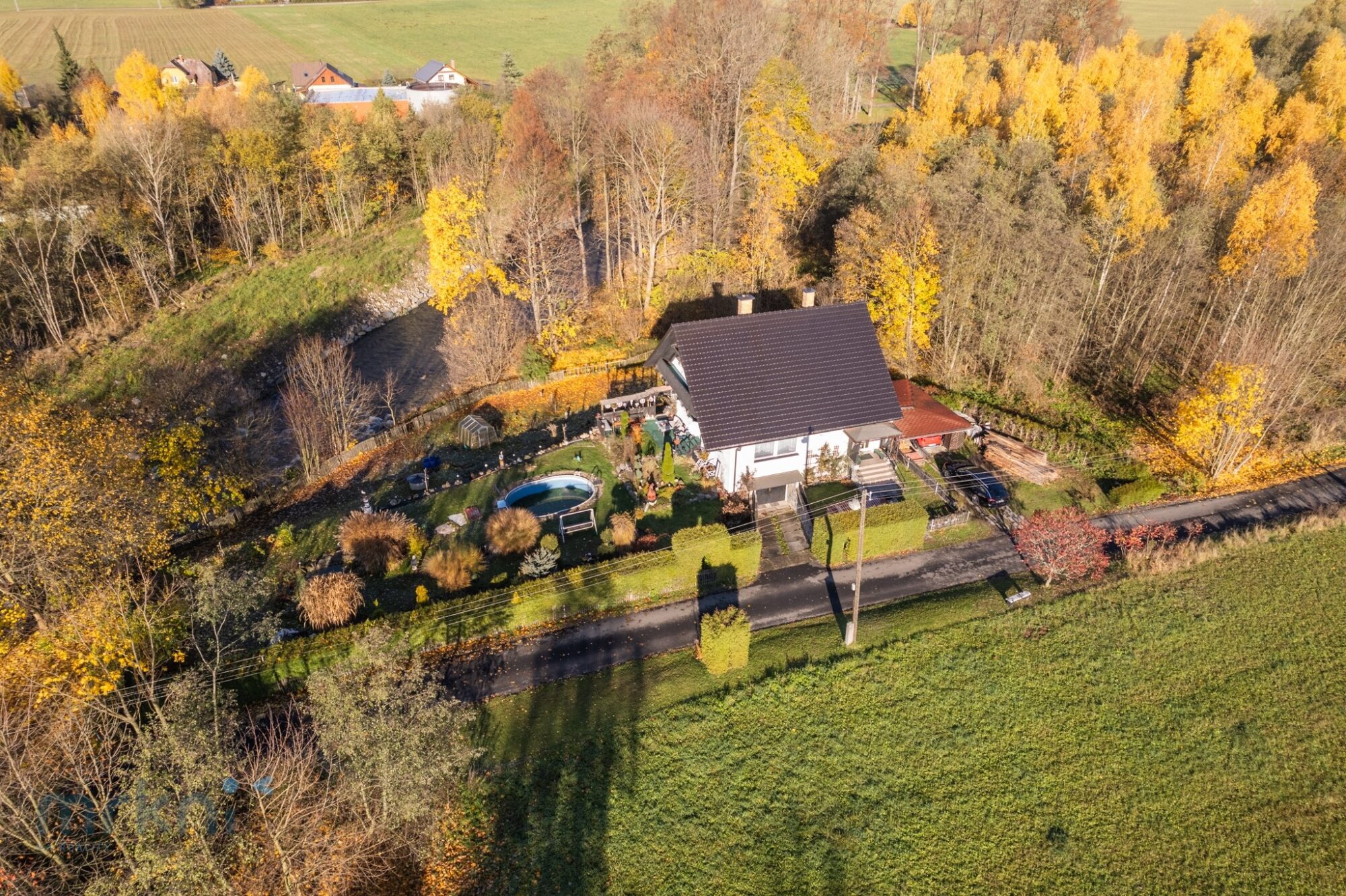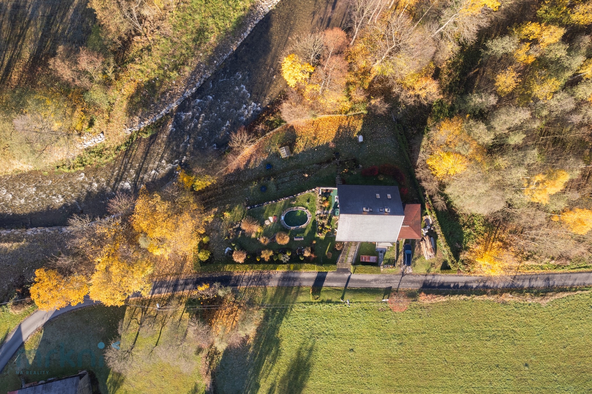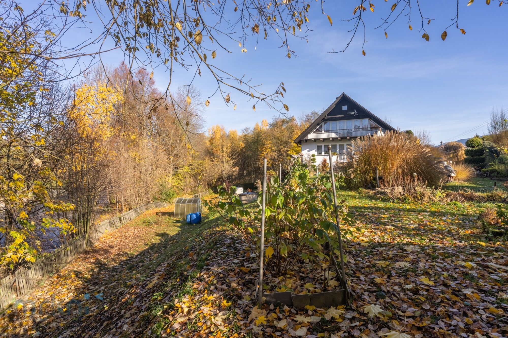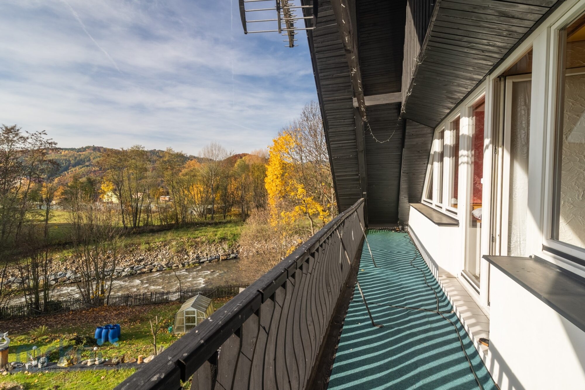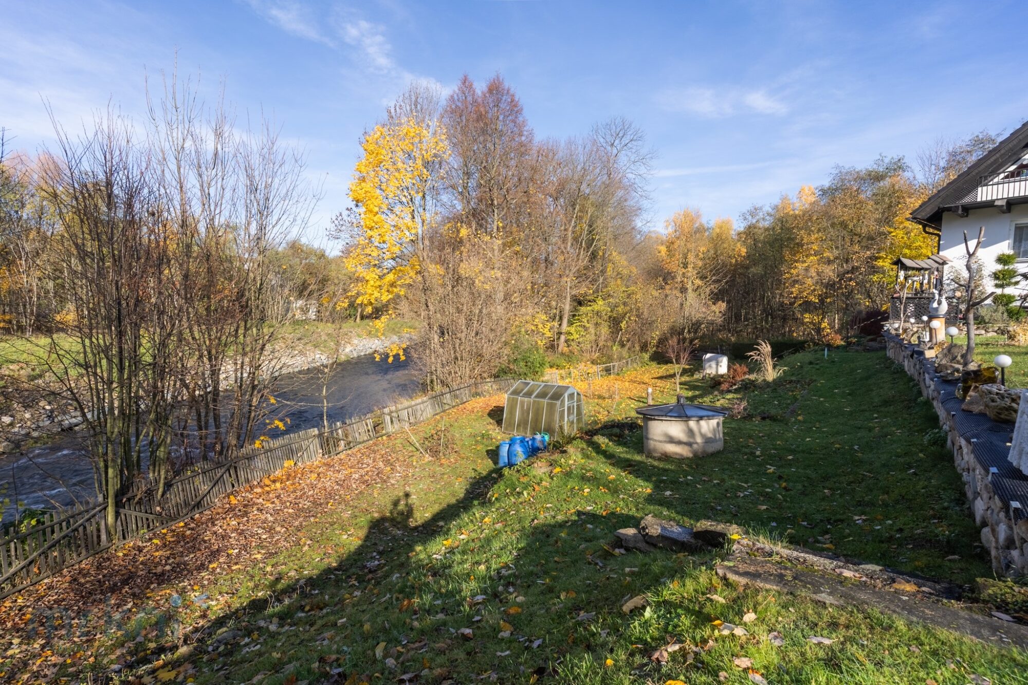 Dům stojí přibližně 20 metrů nad hladinou řeky Desné – blízko přírody, ale bezpečně mimo riziko záplav.