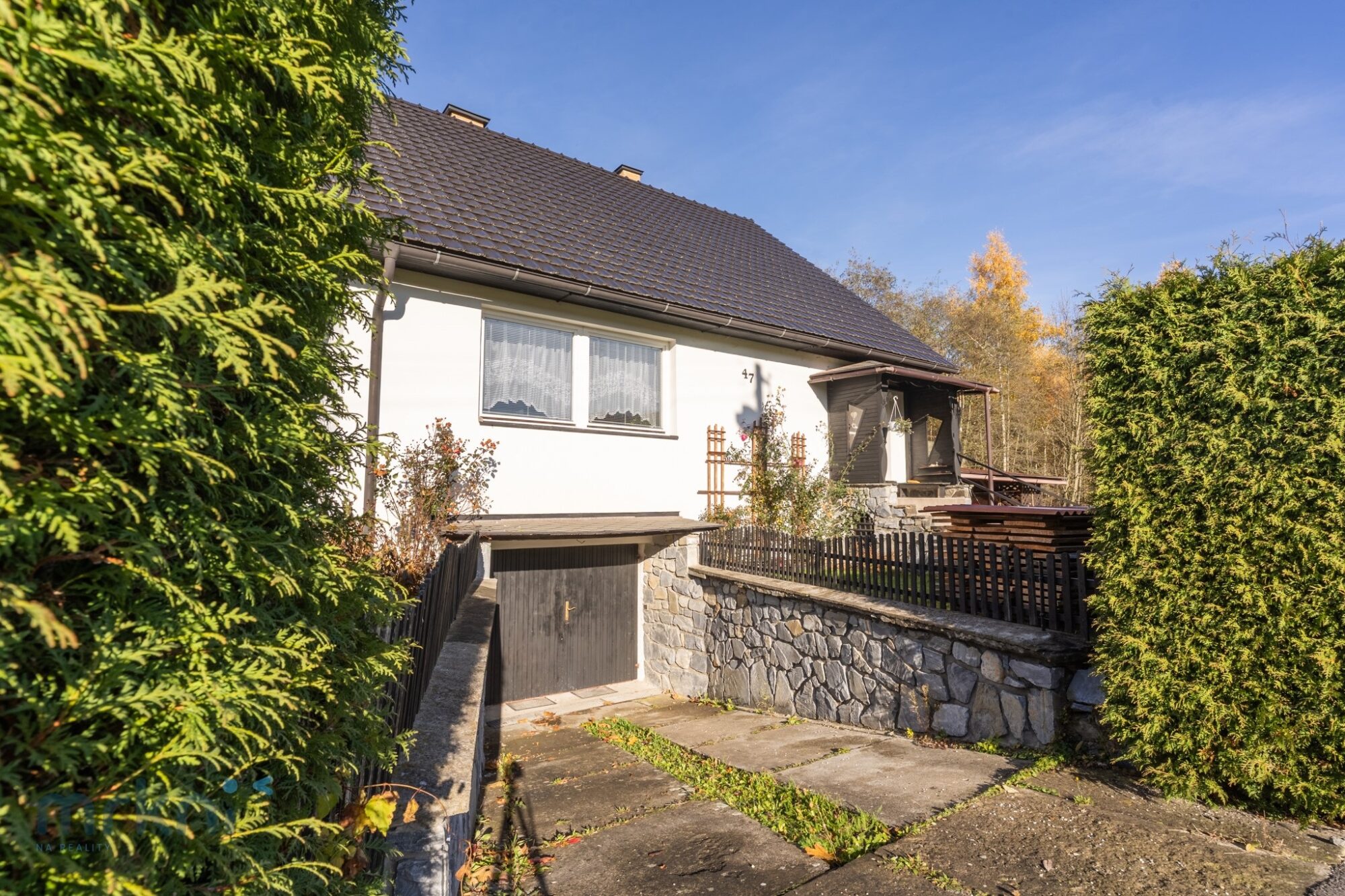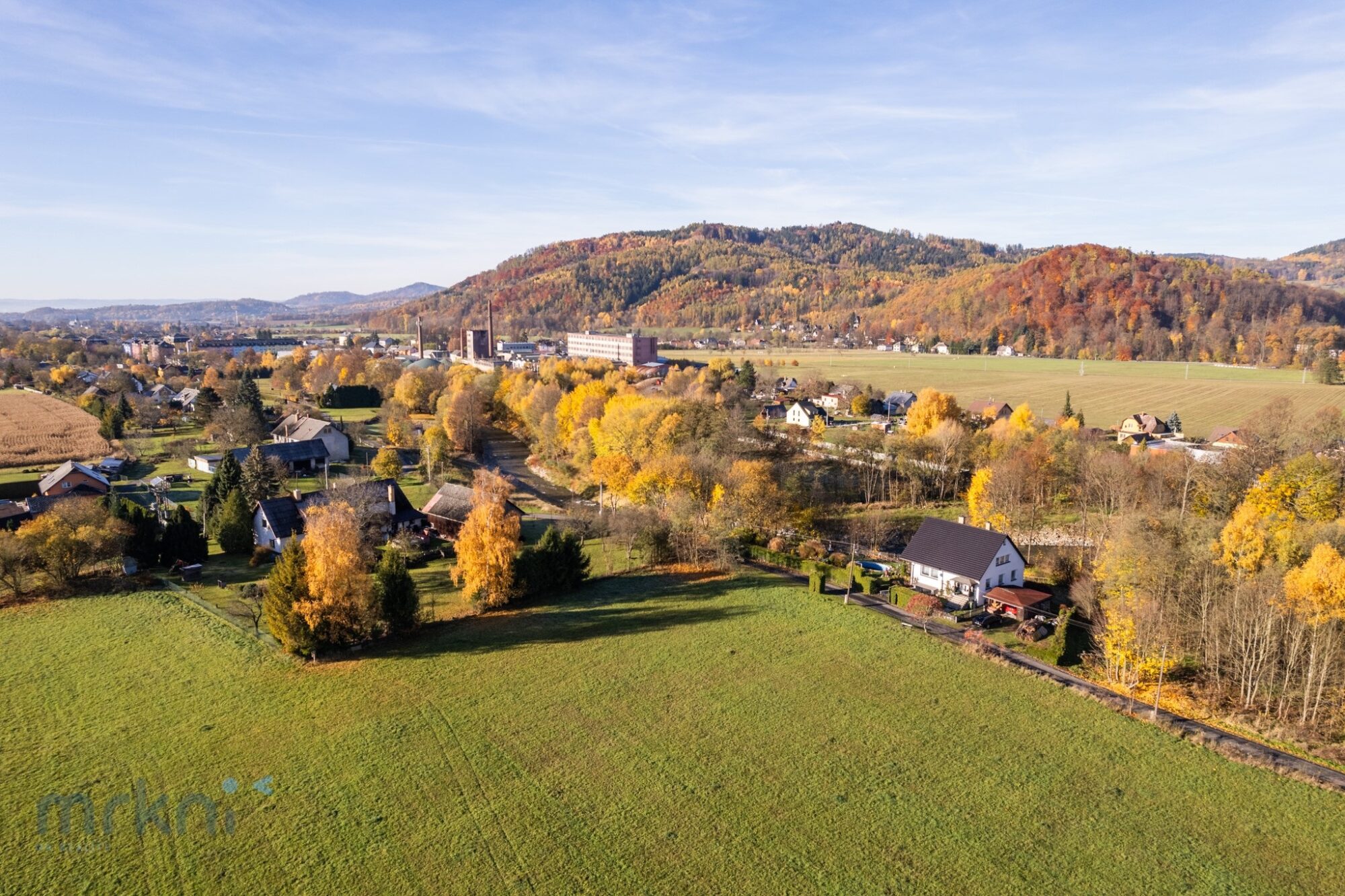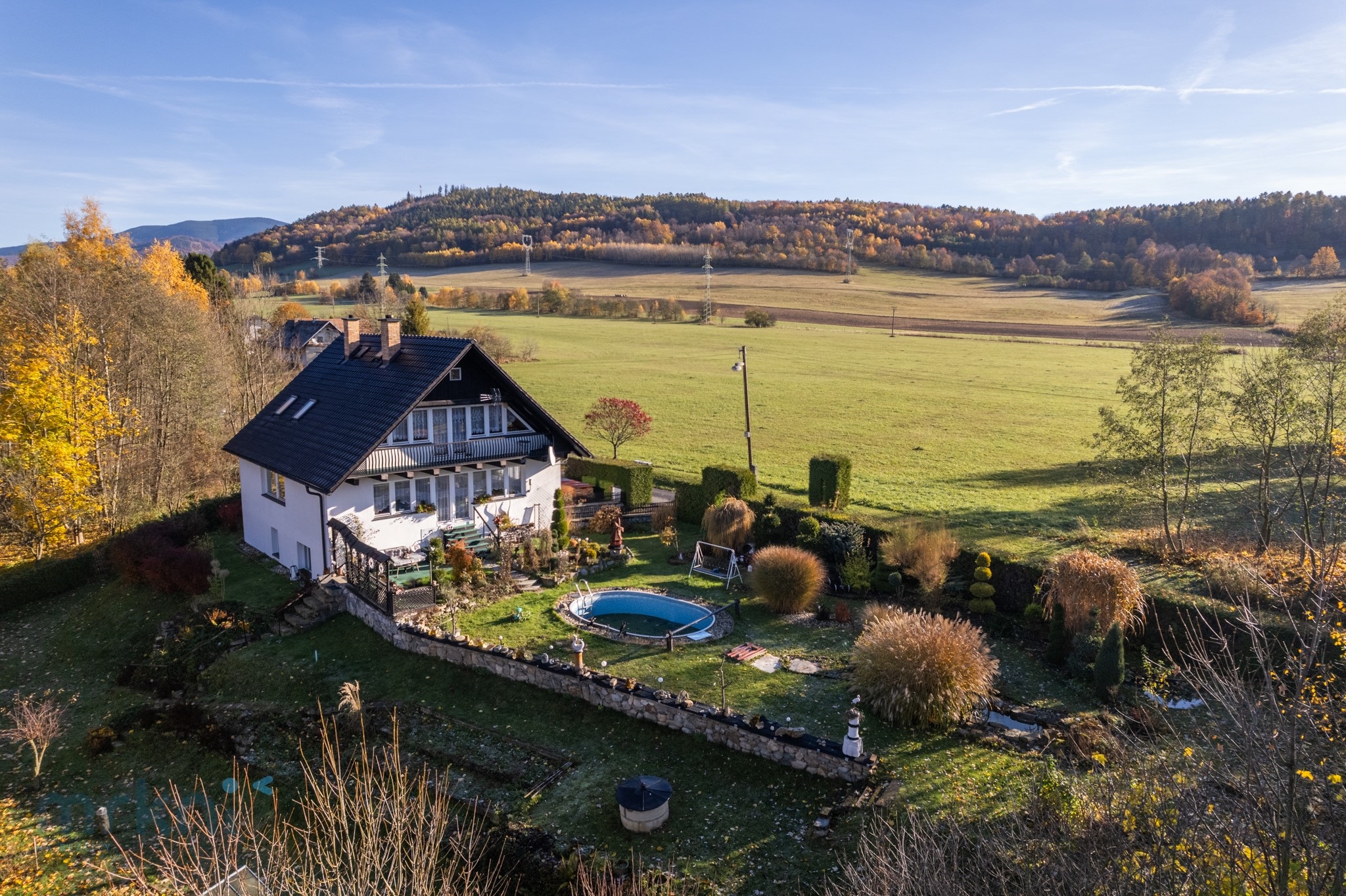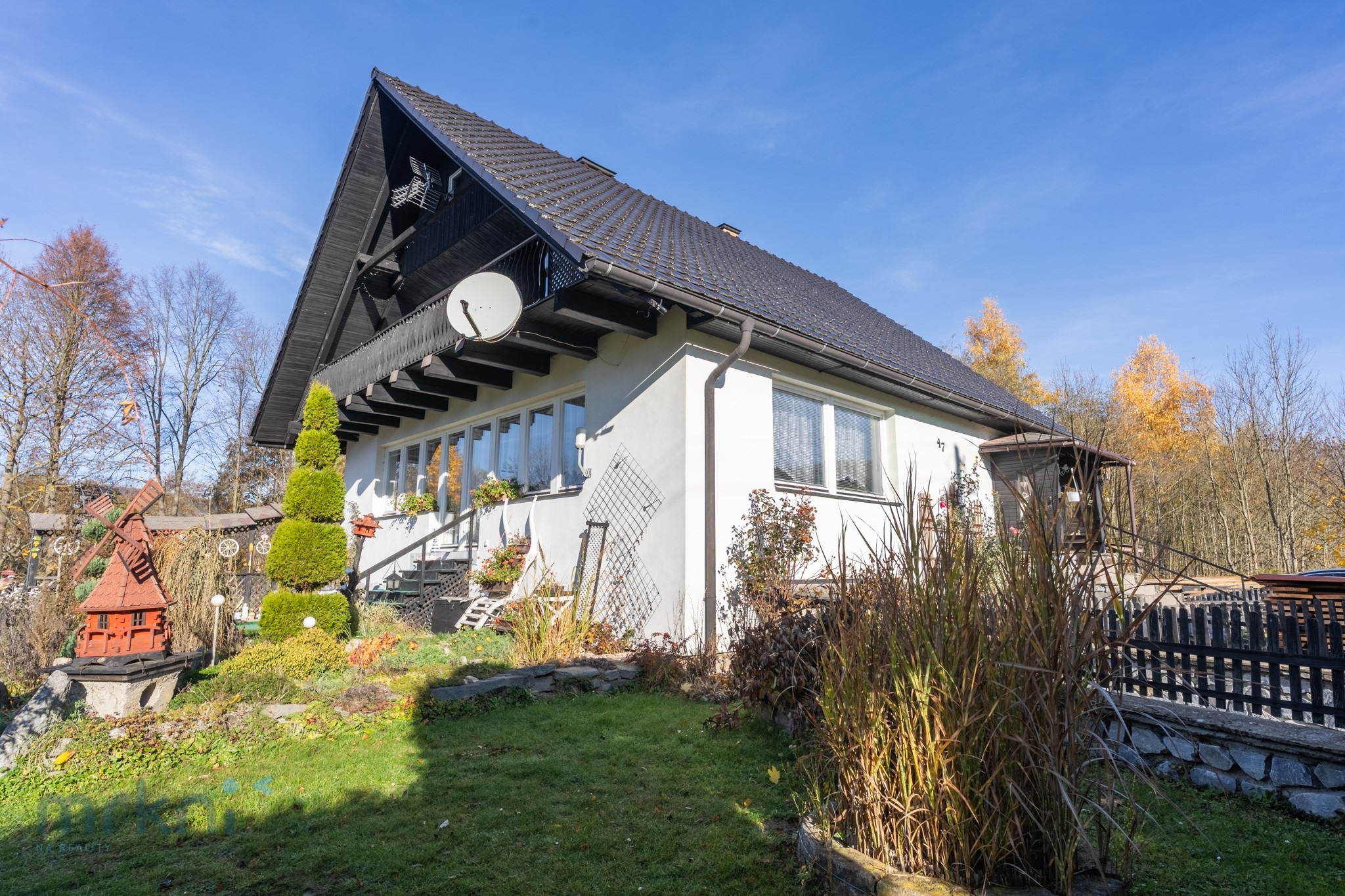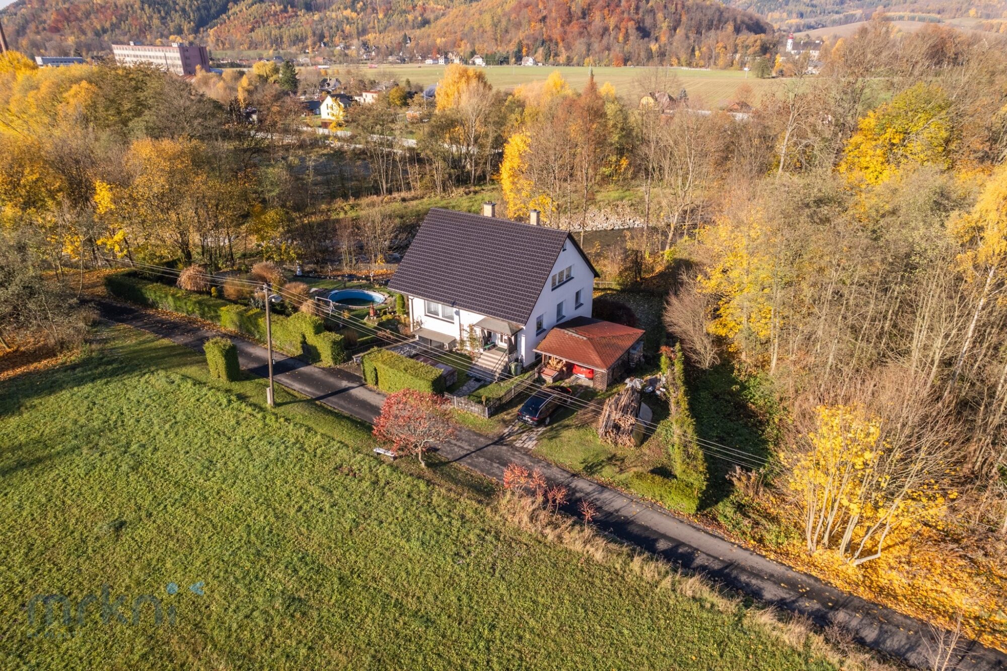 Dům stojí přibližně 20 metrů nad hladinou řeky Desné – blízko přírody, ale bezpečně mimo riziko záplav.