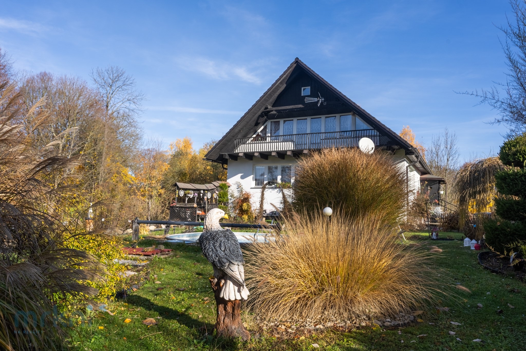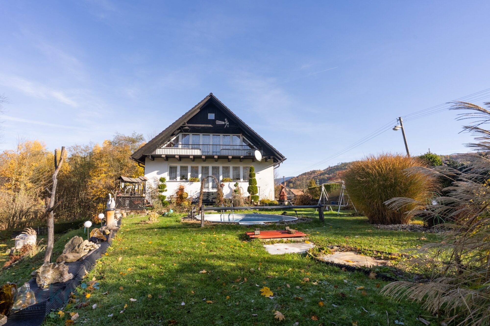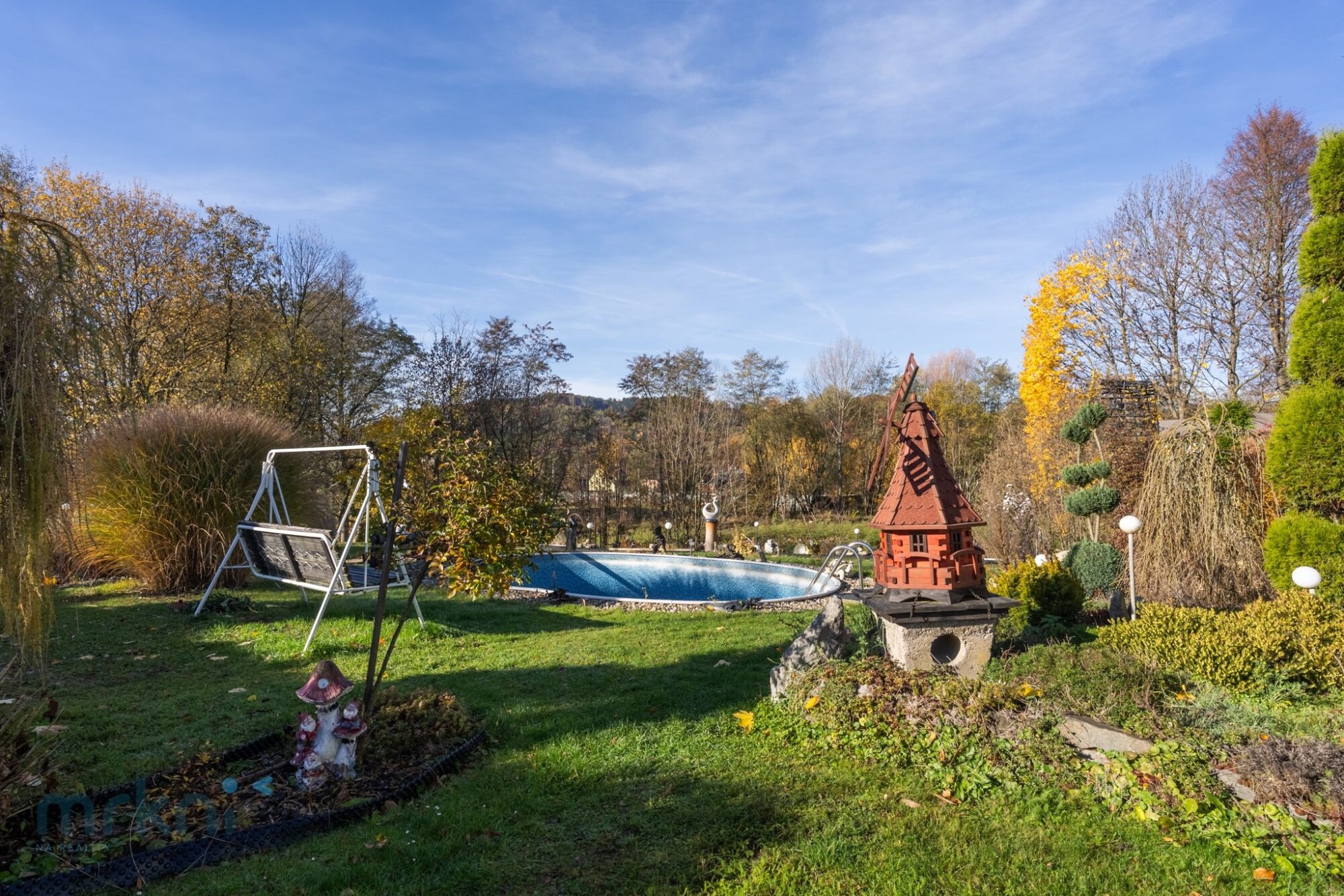 Zahrada je mírně svažitá, zatravněná a udržovaná. Bazén, soukromí, zeleň.