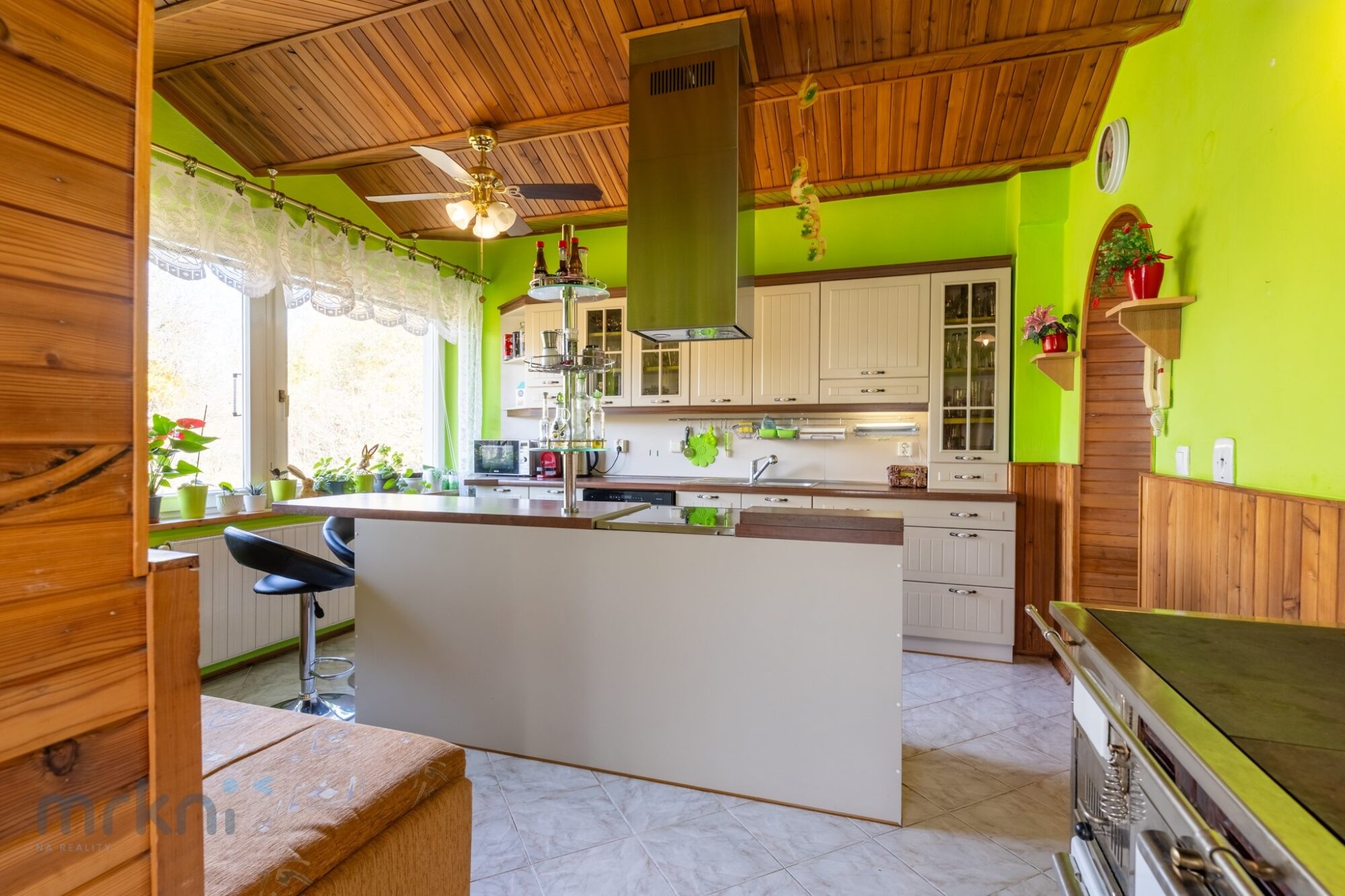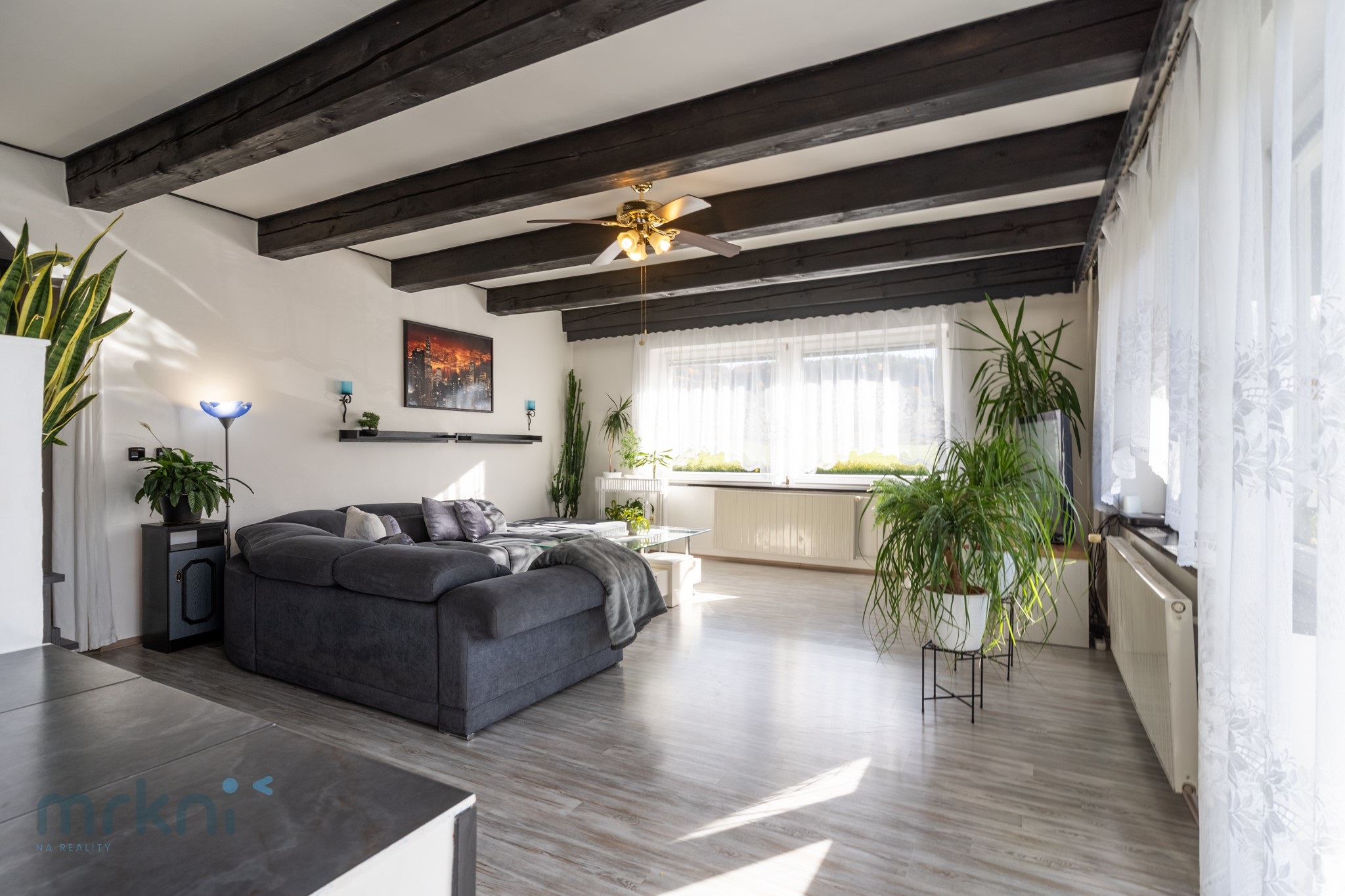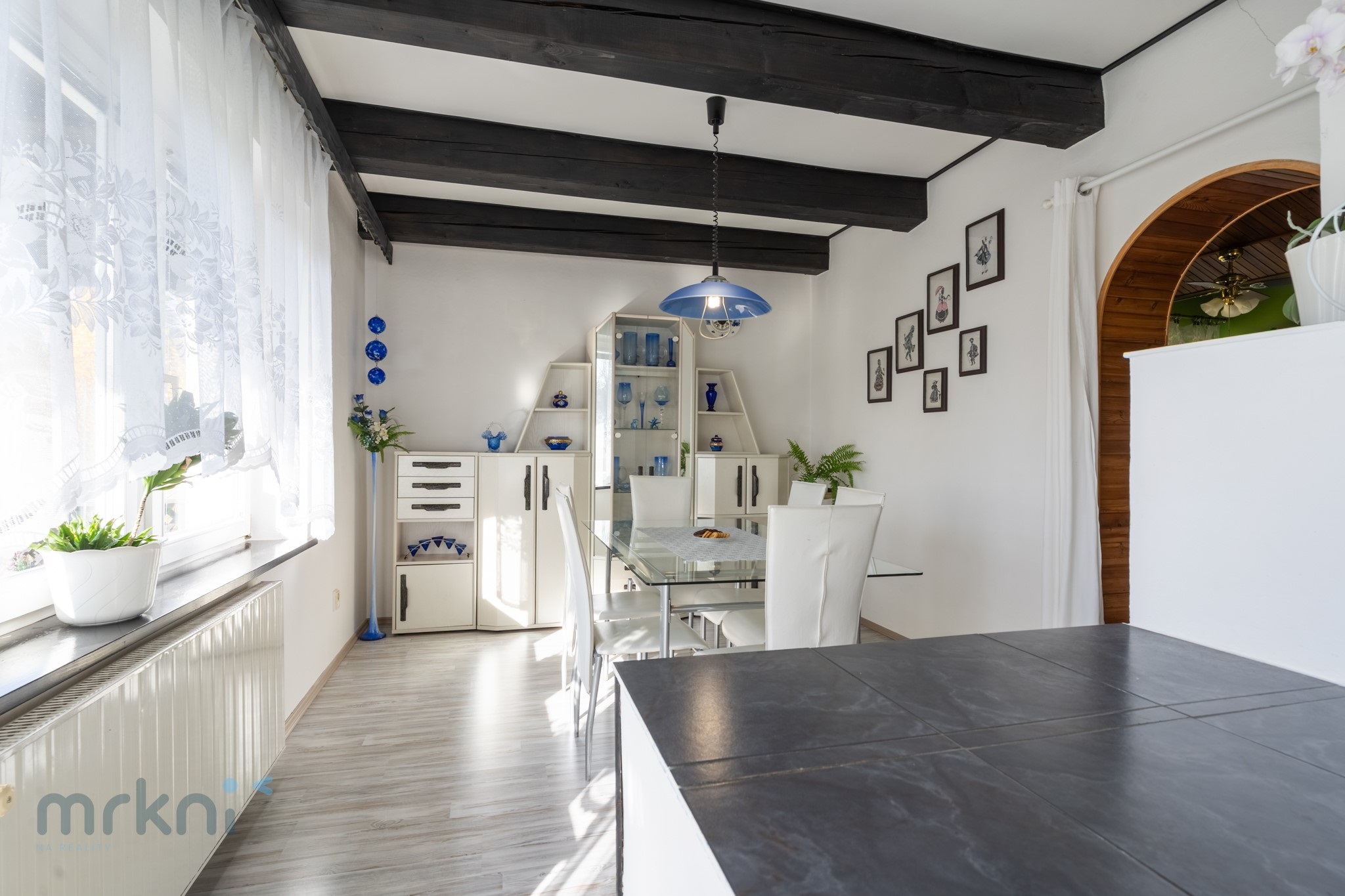 - prostorná kuchyně → jídelna → obývací pokoj (propojené, přirozeně navazují)
