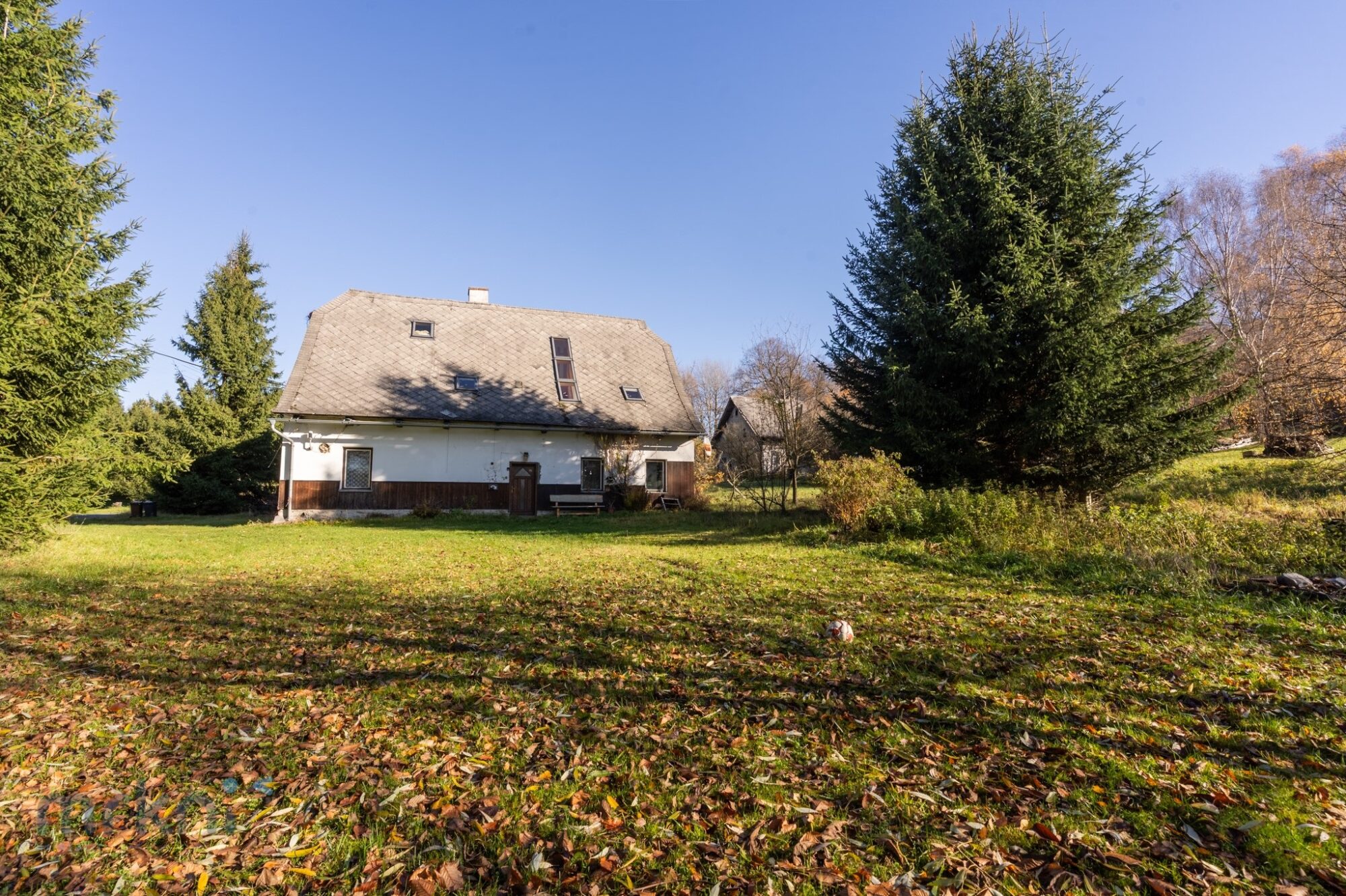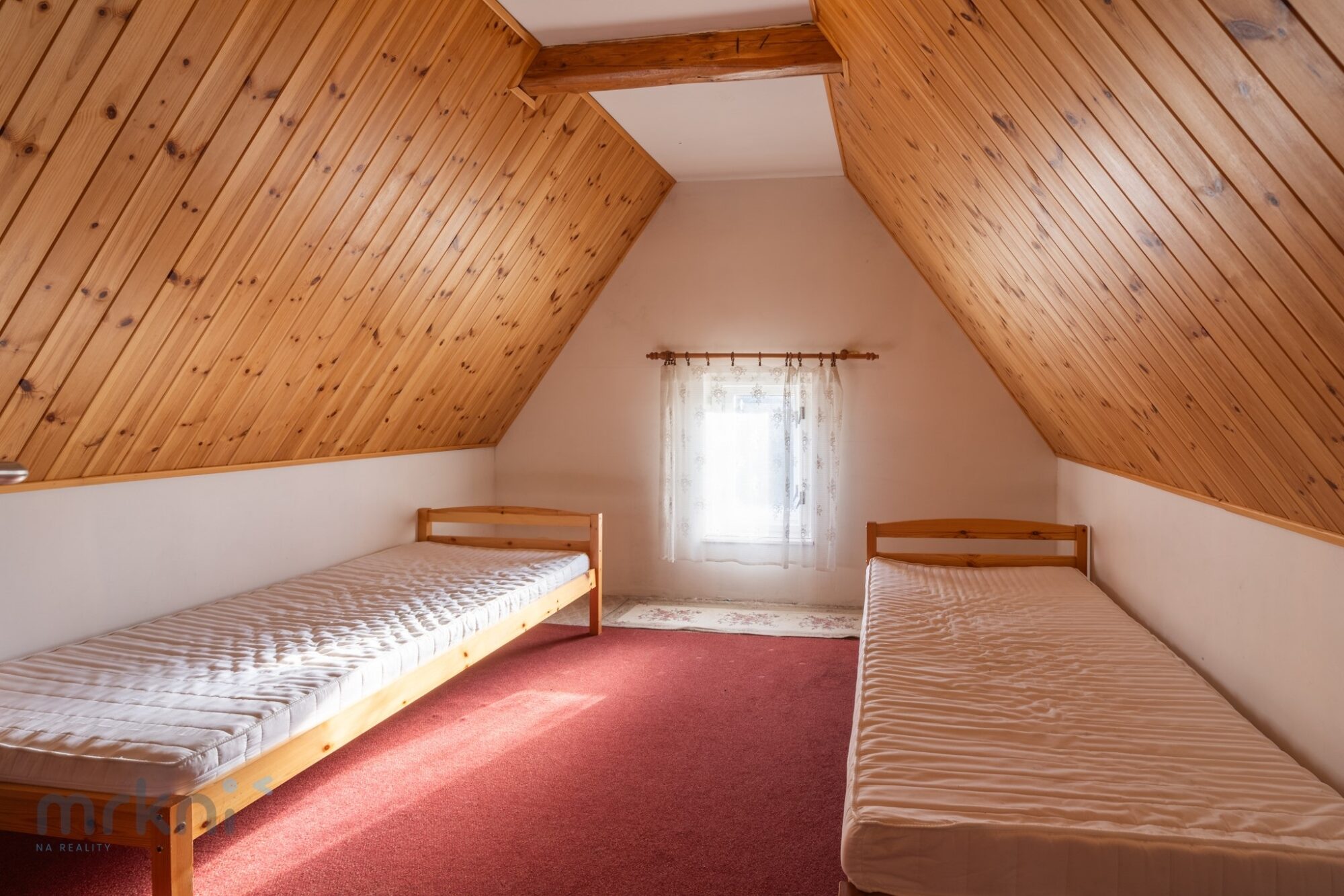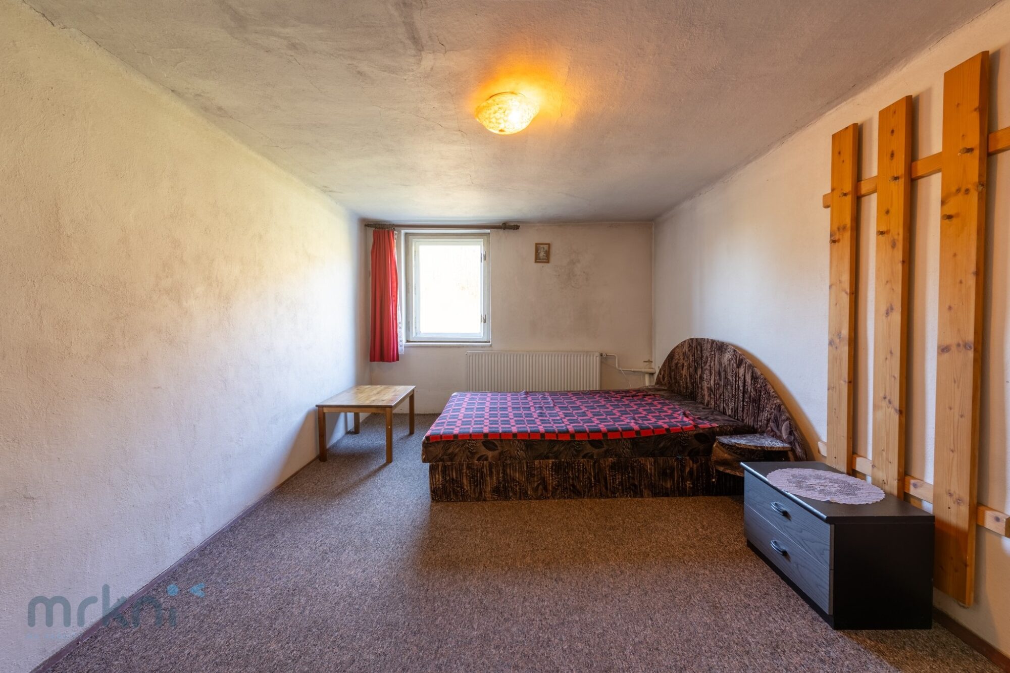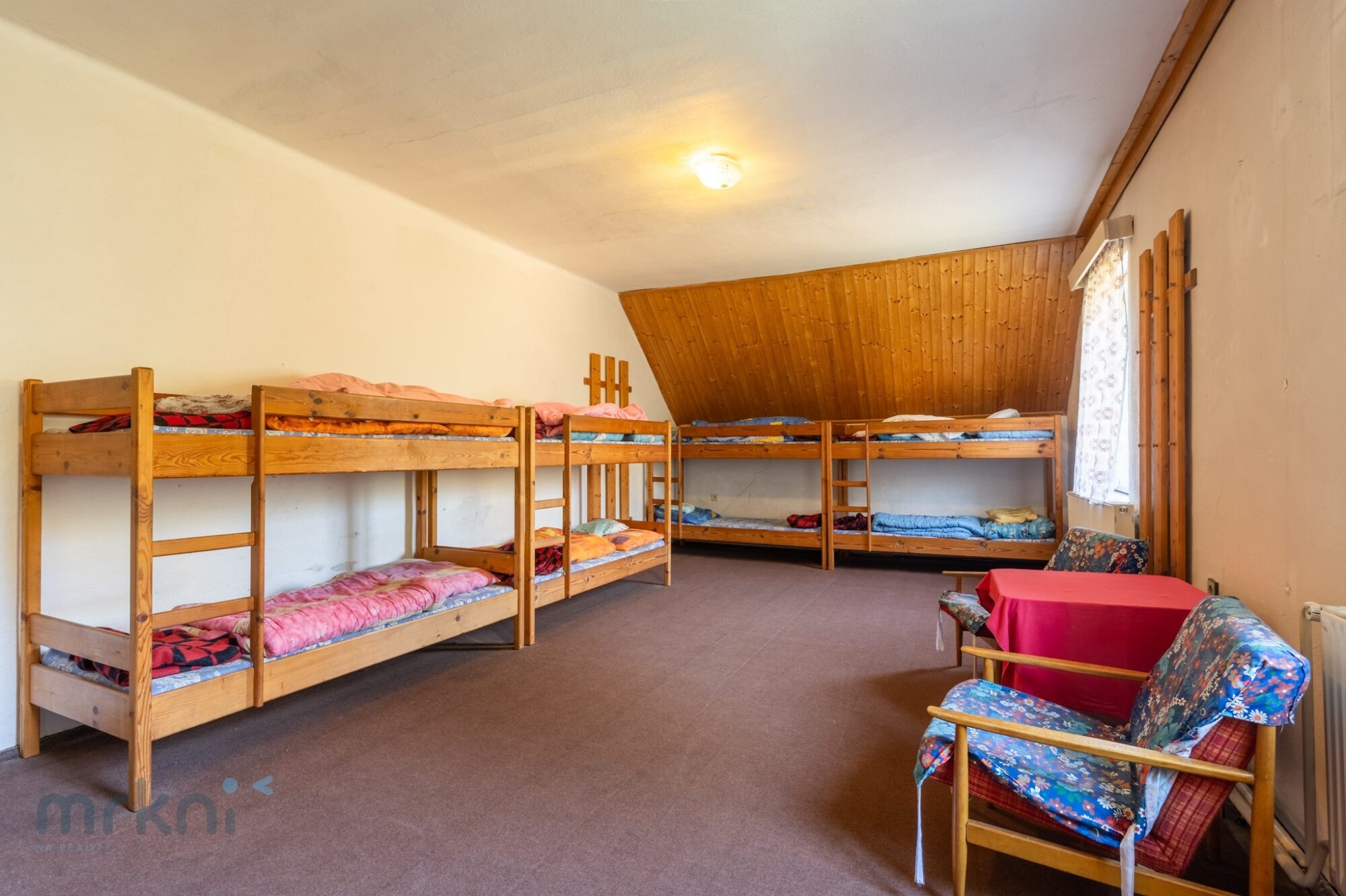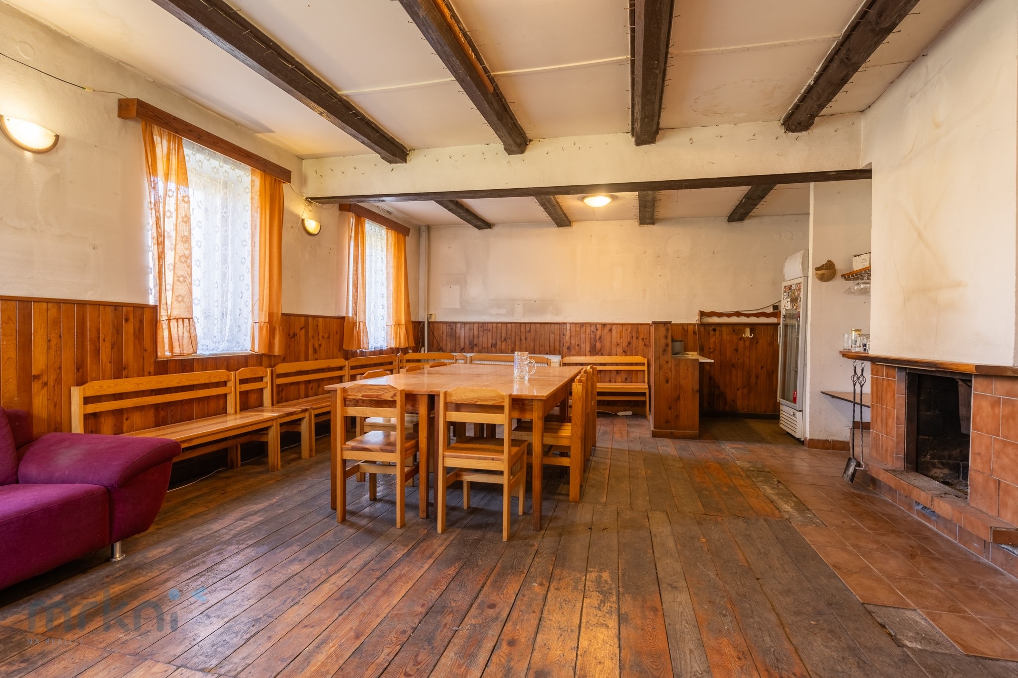 Dominantou chalupy je velká společenská místnost s krbem — přesně to místo, kde se večer potkává celá parta, vznikají vzpomínky a kde dům skutečně ožívá. Díky velikosti objektu můžete po rekonstrukci pohodlně vytvořit kapacitu 20–30 lůžek, což je dnes jedna z nejvyhledávanějších forem ubytování v horách. Voda je ze studny, odpad je řešen jímkou na pozemku a aktuální vytápění zajišťuje kotel na tuhá paliva.