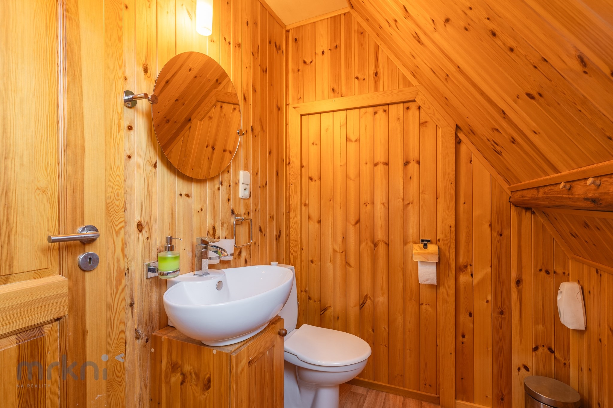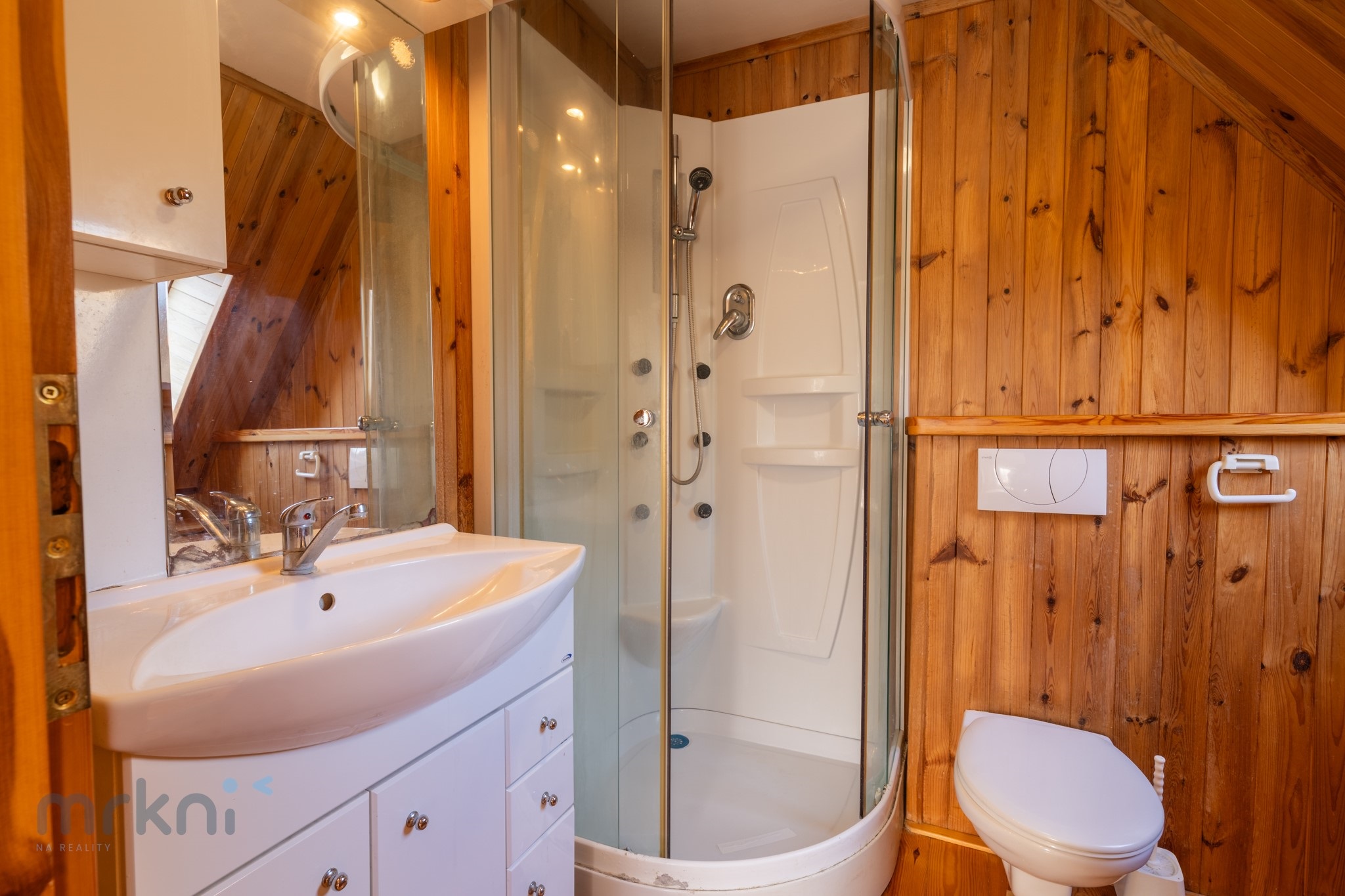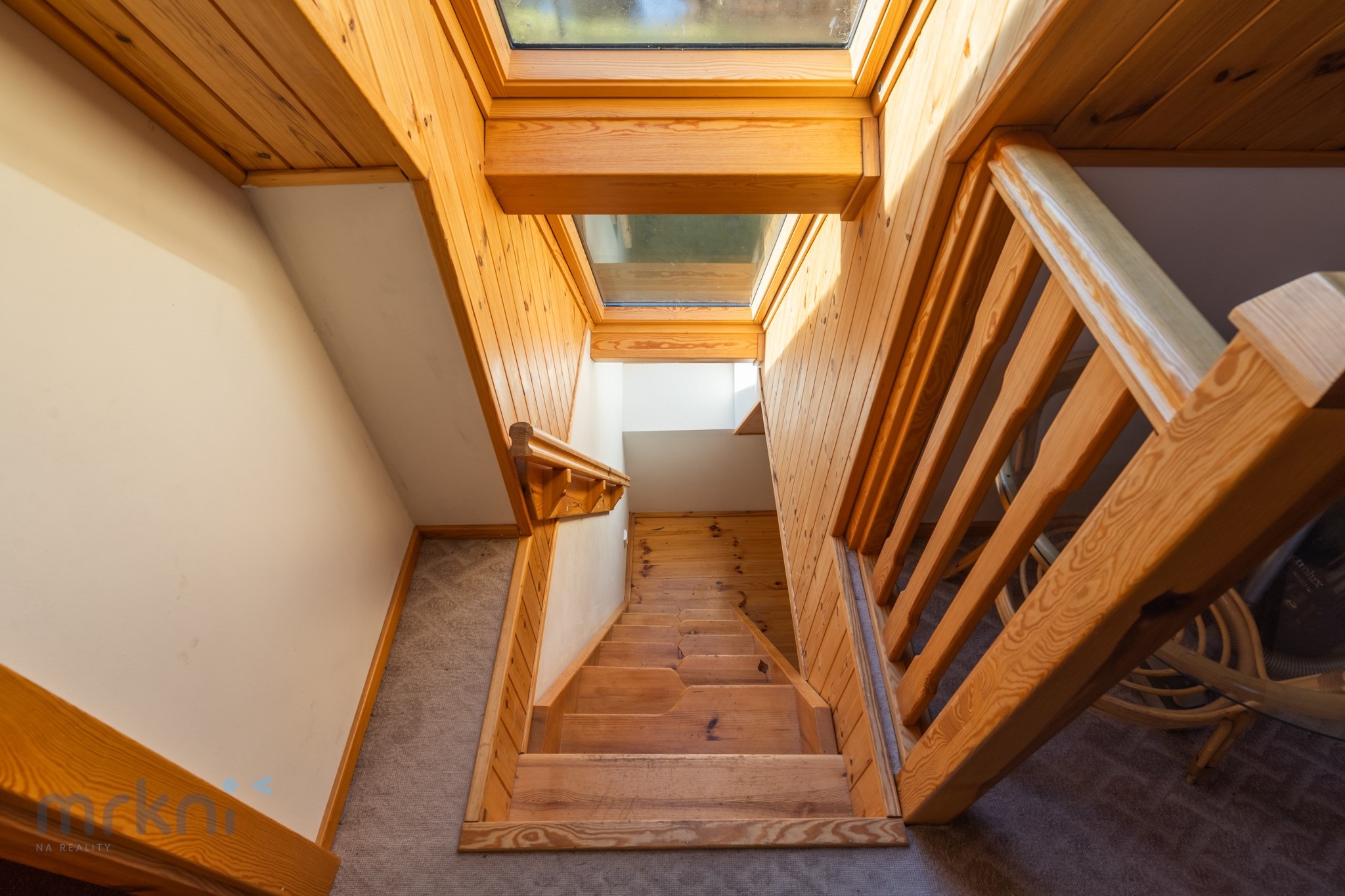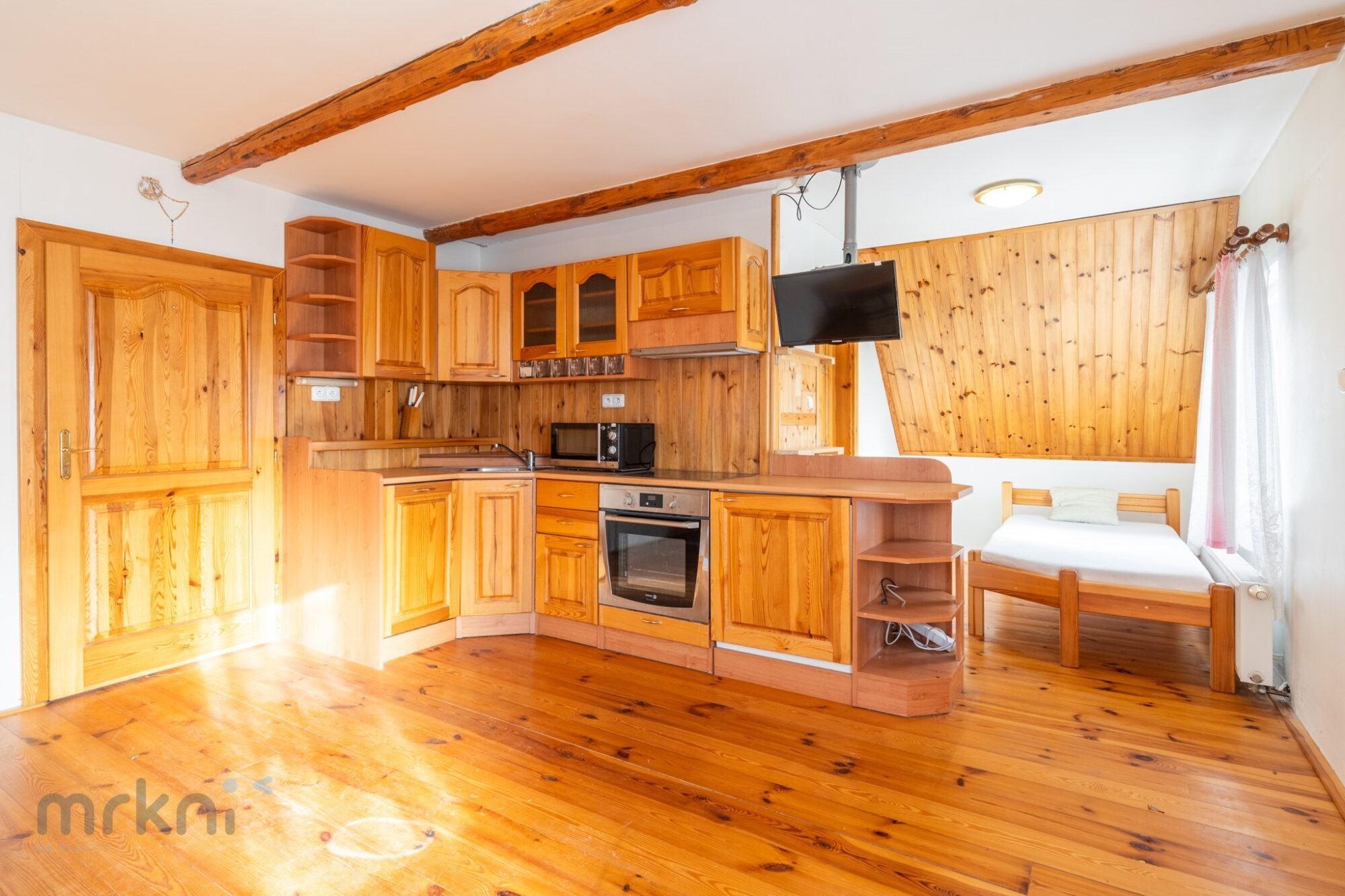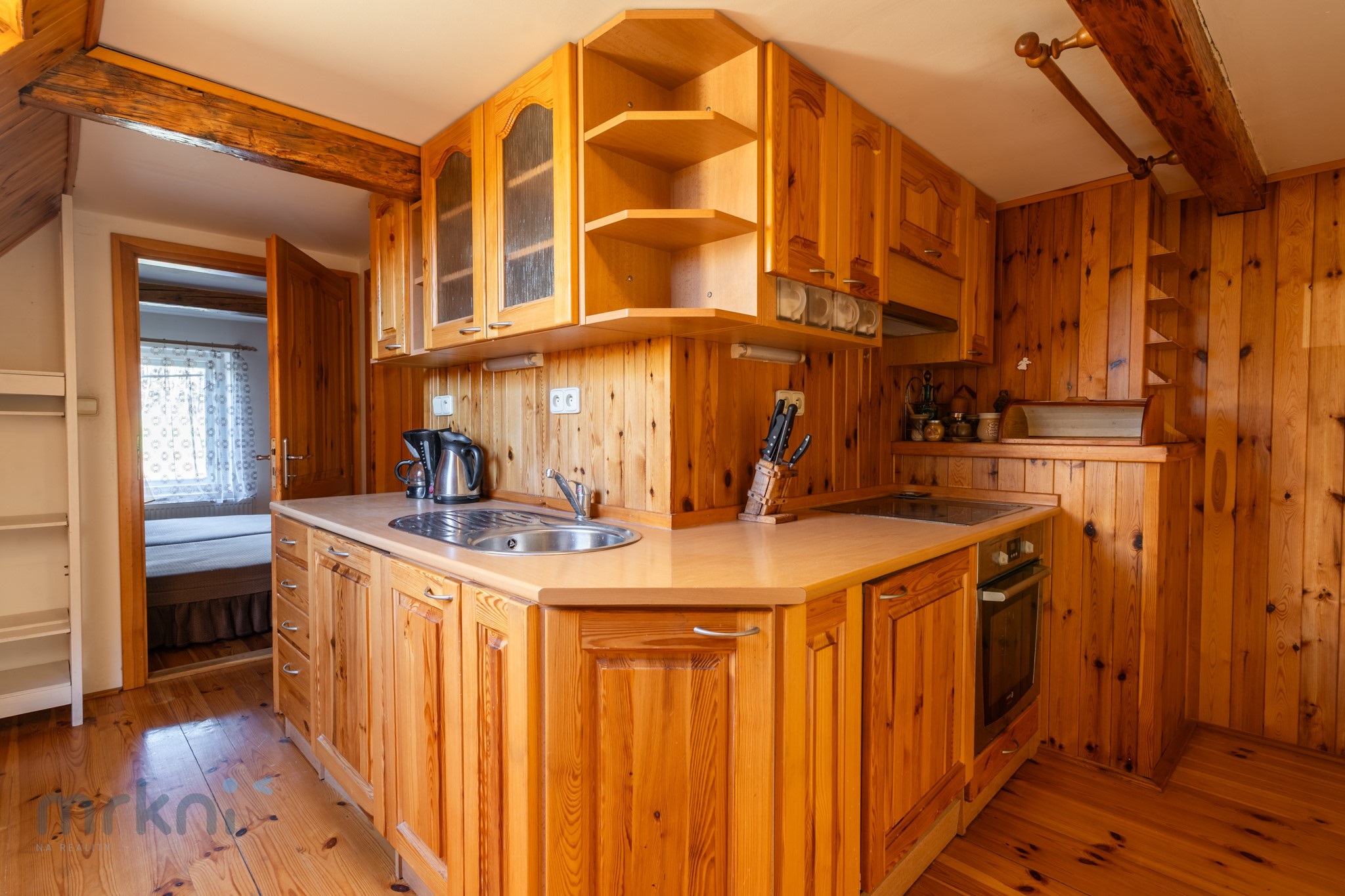 Dominantou chalupy je velká společenská místnost s krbem — přesně to místo, kde se večer potkává celá parta, vznikají vzpomínky a kde dům skutečně ožívá. Díky velikosti objektu můžete po rekonstrukci pohodlně vytvořit kapacitu 20–30 lůžek, což je dnes jedna z nejvyhledávanějších forem ubytování v horách. Voda je ze studny, odpad je řešen jímkou na pozemku a aktuální vytápění zajišťuje kotel na tuhá paliva.